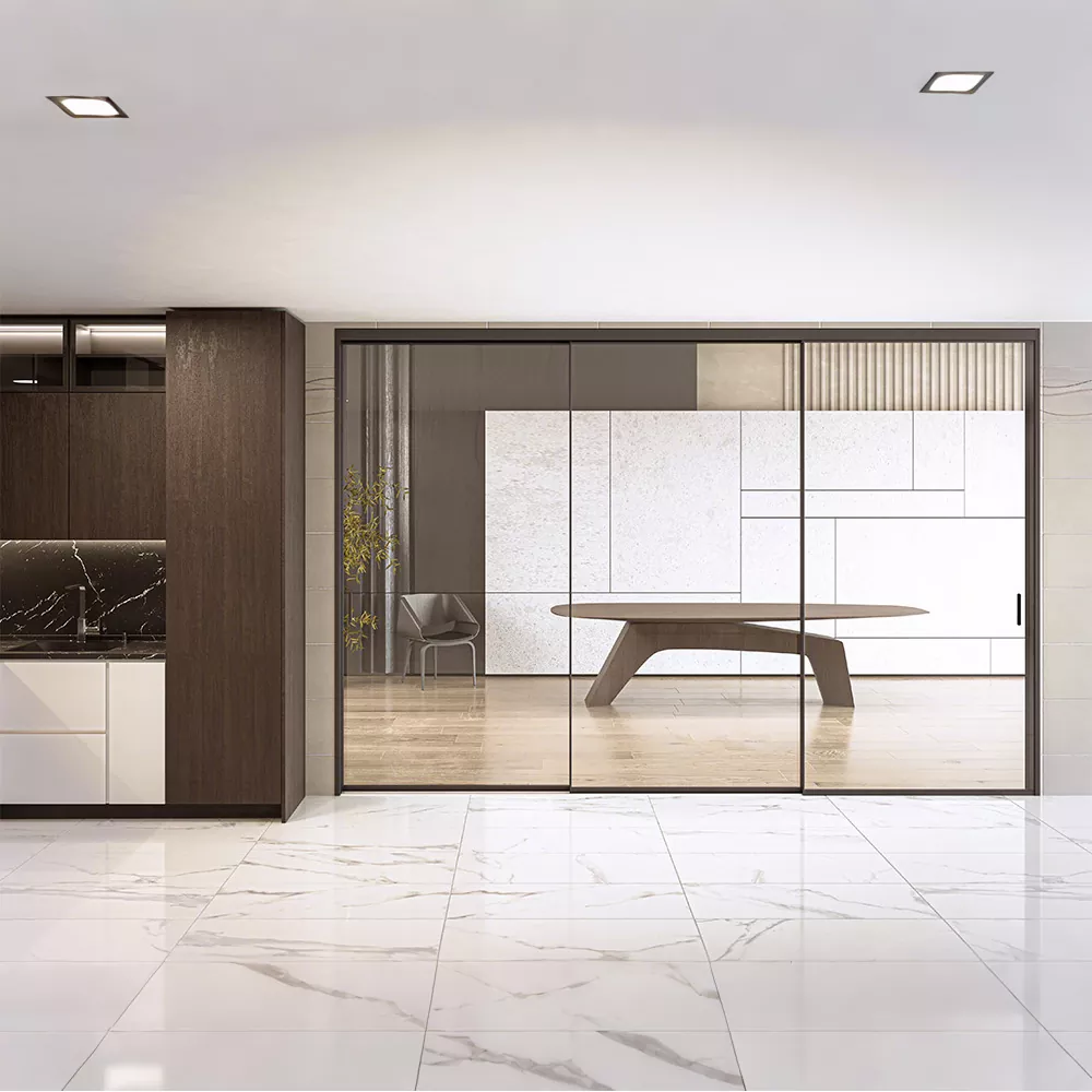 Extrémne úzke posuvné dvere odkazujú na použitie ultra úzkeho rámu + minimalistický dizajn koľajníc s 1,5-2 cm extrémne úzkym okrajom, ktorý prelomí ťažký pocit tradičných posuvných dverí, čím sa priestor stáva transparentnejším a otvorenejším. Či už ide o rozšírenie kapacity malého bytu alebo umocnenie pocitu luxusu vo veľkom byte, dokáže dosiahnuť dokonalú rovnováhu medzi funkciou a estetikou v podobe „neviditeľnej hranice“.