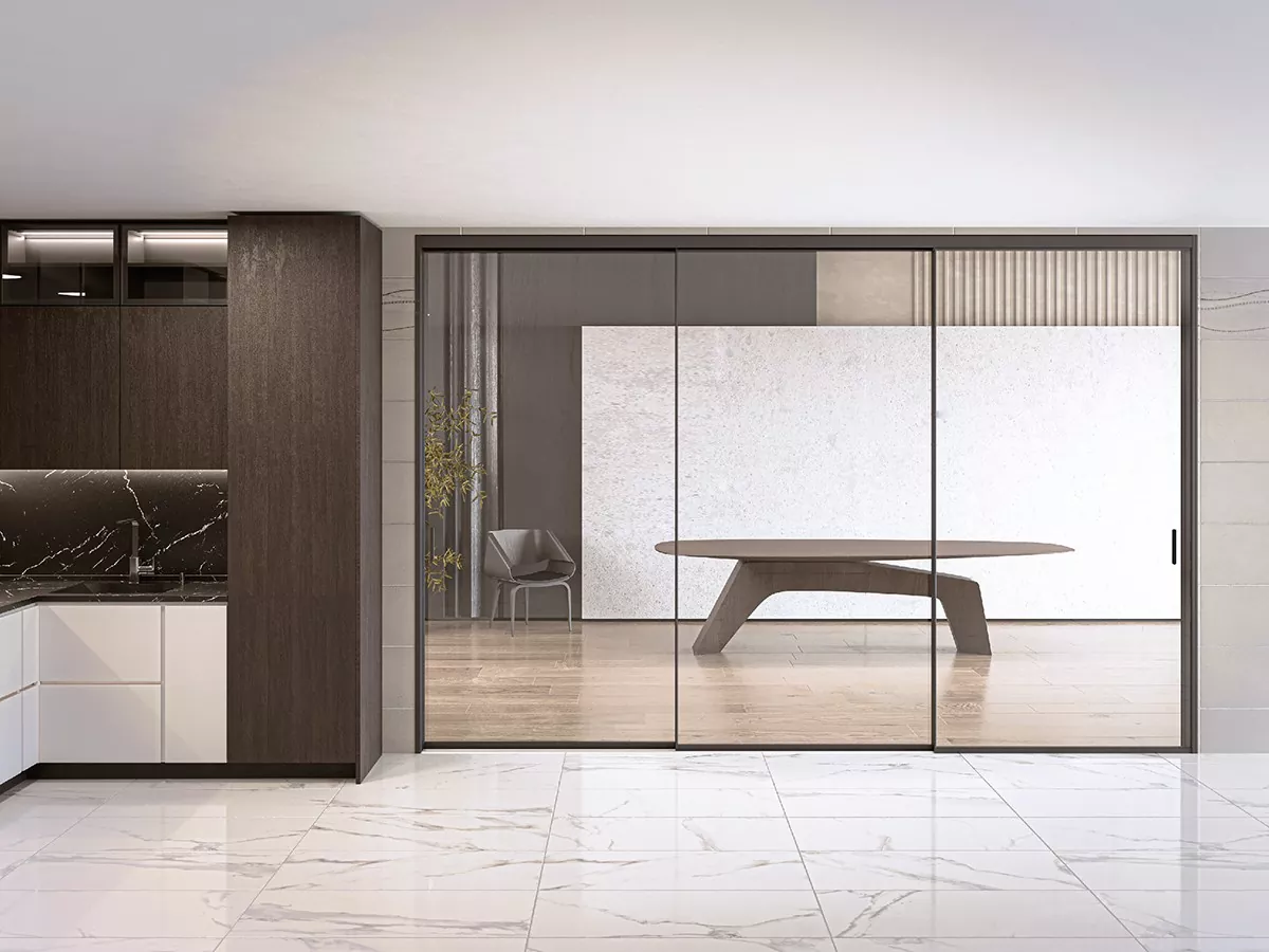 1. Jednoduchý dizajn: Extrémne jednoduché sklenené posuvné dvere využívajú skrytý alebo poloskrytý systém koľajníc, aby dvere vyzerali úhľadnejšie. Tento dizajn zvyčajne používa moderné materiály, ako je sklo a hliníková zliatina, ktoré môžu zlepšiť osvetlenie miestnosti a poskytnúť ľuďom otvorený vizuálny efekt.