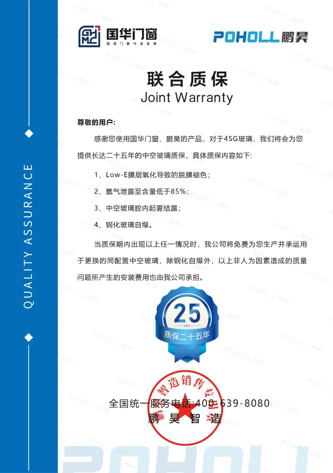 Ešte pozoruhodnejšie je, že Guohua Doors & Windows a Penghao spoločne spustili predĺženú záruku, ktorá poskytuje sklo 4SG s 25-ročnou zárukou na izolačné sklo. Tento záväzok sa vzťahuje na niekoľko kľúčových problémov vrátane delaminácie a odfarbenia spôsobeného oxidáciou filmu Low-E, úniku argónového plynu pod 85 %, zahmlievania a kondenzácie v dutine izolačného skla a spontánnej explózie tvrdeného skla. Takáto komplexná a dlhodobá záruka je v tomto odvetví zriedkavá a plne demonštruje dôveru oboch strán v kvalitu produktov a ich hlboký záväzok voči zákazníkom.